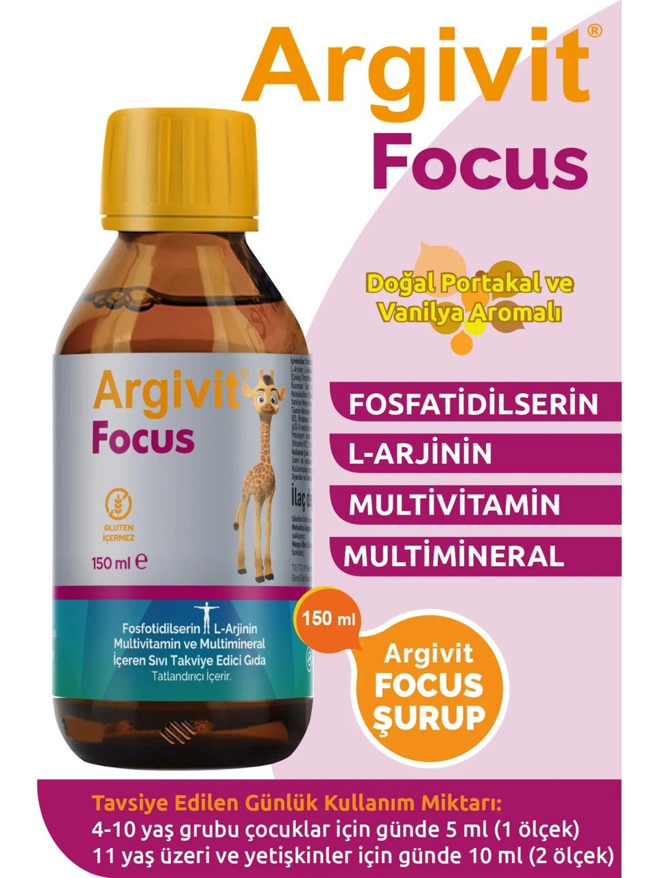 Argivit Focus Şurup 150 ml; fosfatidilserin, L-arjinin, multivitamin ve multimineral içeren takviye edici gıdadır. Çocuklar için özel olarak geliştirilmiş sıvı formu sayesinde kolay kullanım sunar.