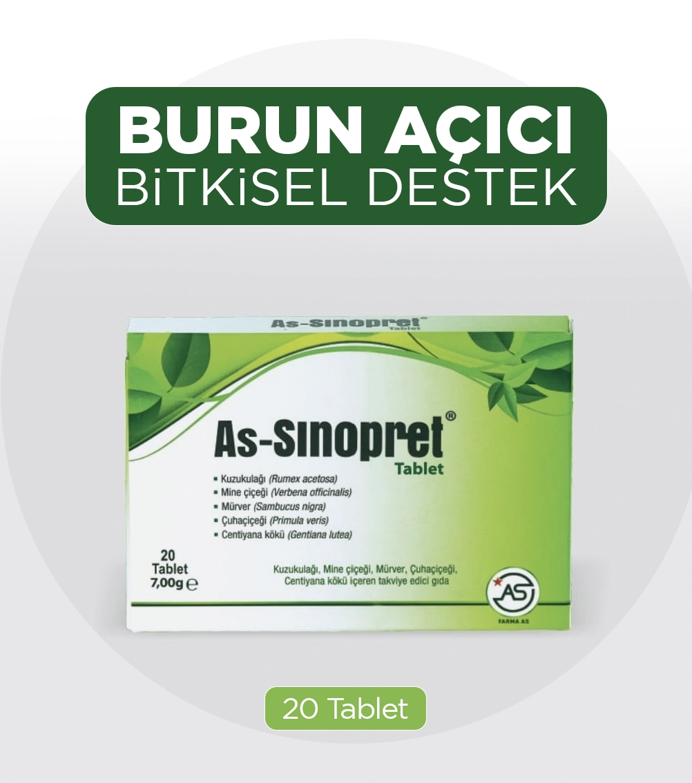 As Sinopret 20 Tablet, burun tıkanıklığı, sinüs doluluğu ve solunum yolları problemlerine karşı destek sağlayan bitkisel içerikli takviye edici gıdadır. Özel formülü sayesinde üst solunum yollarının rahatlamasına yardımcı olur.